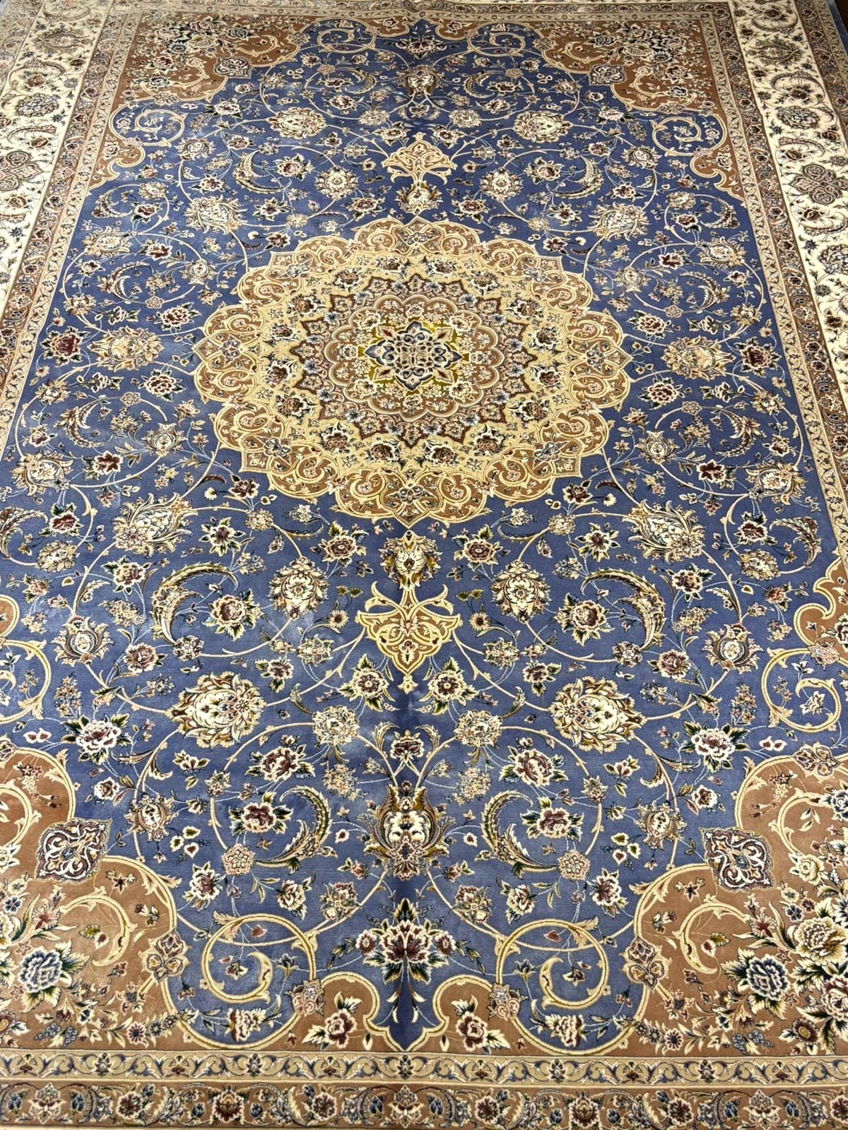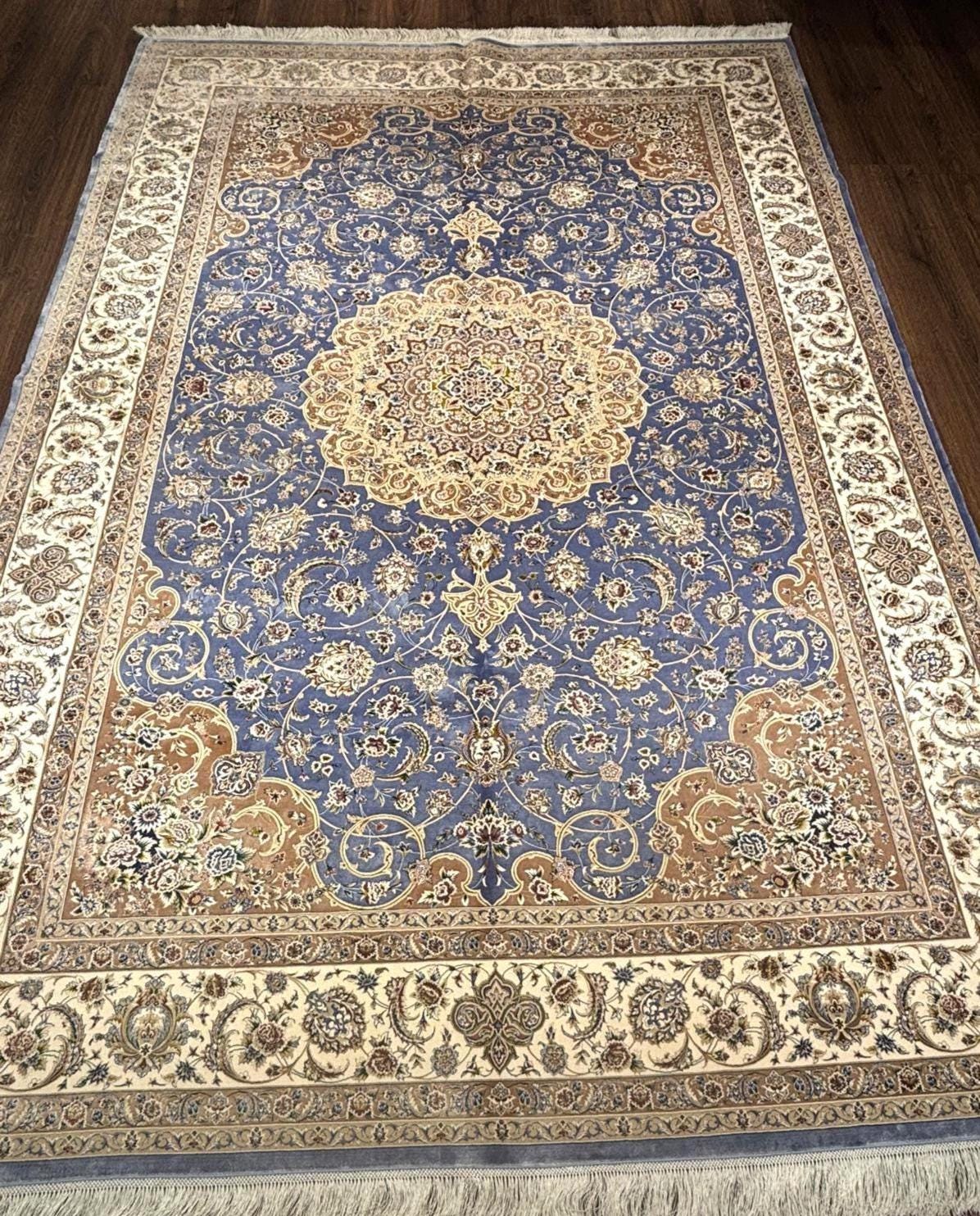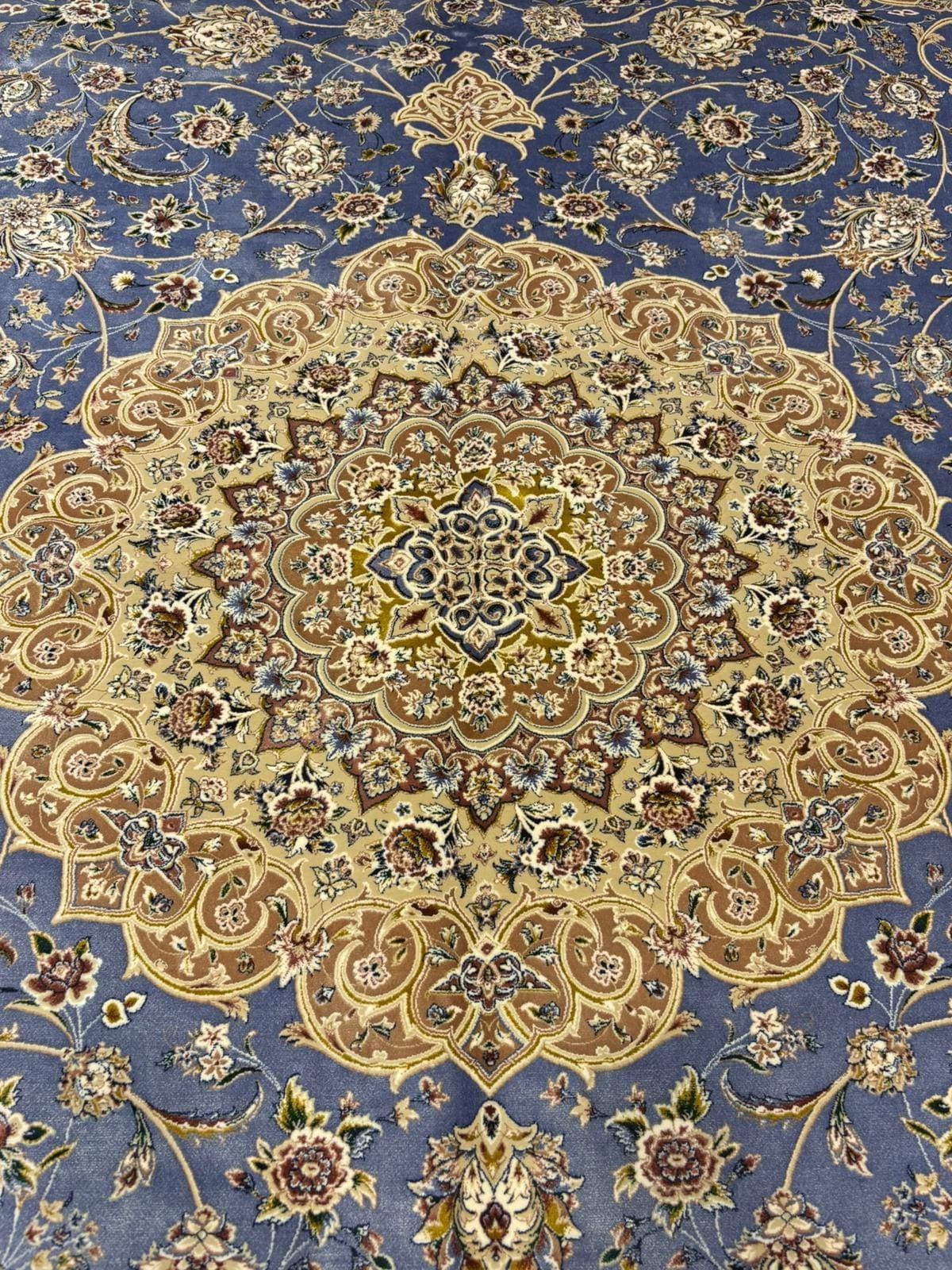 * Silk and wool blend * Handmade craftsmanship * Central medallion design * Detailed floral patterns * Soft texture with durable structure * Elegant blue and beige color palette * Fine high-density weaving