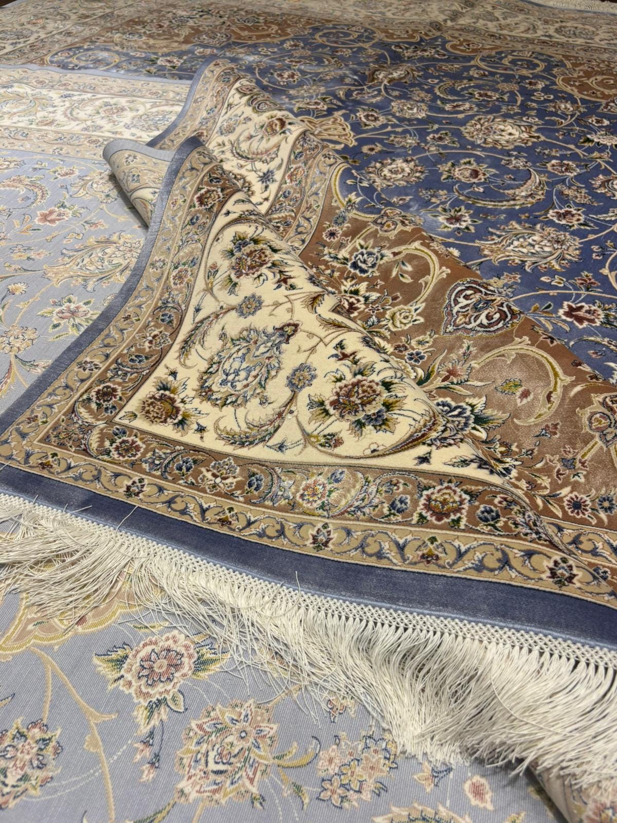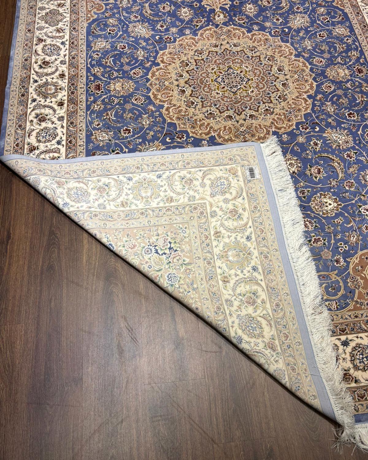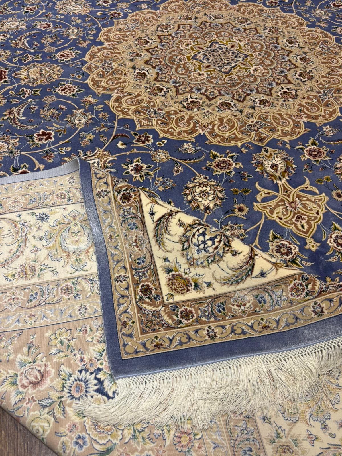 This handmade silk and wool rug is a stunning example of timeless elegance and fine craftsmanship. Featuring a rich blue background with a detailed central medallion, this piece brings depth, sophistication, and harmony into any interior space.